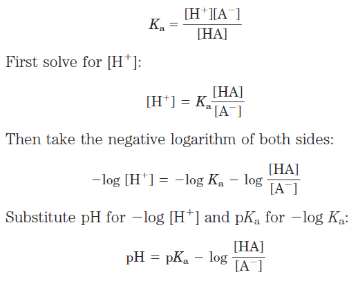 Now invert _log [HA]/[Aˉ], which involves changing its sign, to obtain the Henderson-Hasselbalch equation: