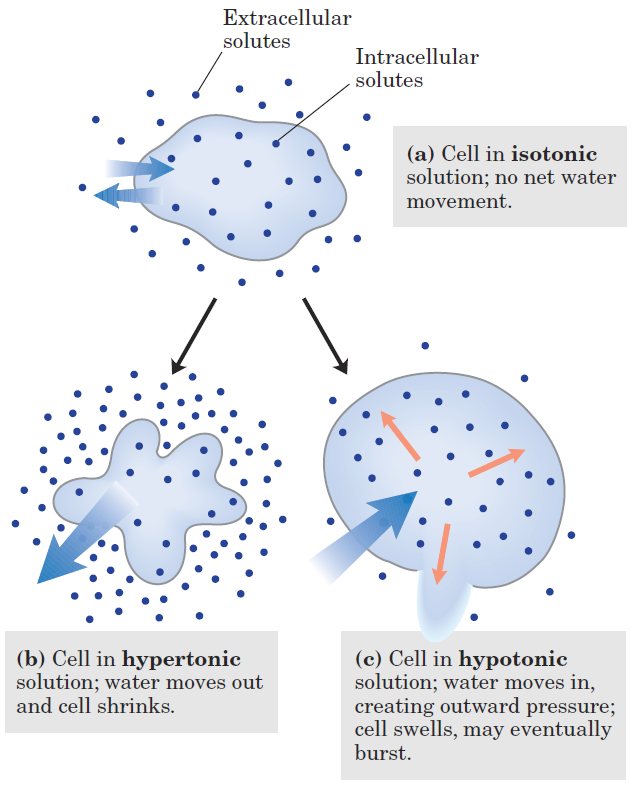 FIGURE 1.1 Effect of extracellular osmolarity on water movement across a plasma membrane. When a cell in osmotic balance with its surrounding medium (that is, in an isotonic medium) (a) is transferred into a hypertonic solution (b) or hypotonic solution (c), water moves across the plasma membrane in the direction that tends to equalize osmolarity outside and inside the cell.