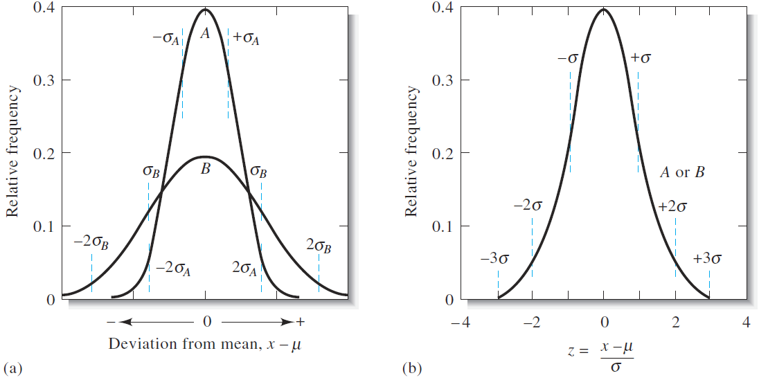 where N is the number of data points making up the population. The two curves in Figure 1.1a are for two populations of data that differ only in their standard deviations. The standard deviation for the data set yielding the broader but lower curve B is twice that for the measurements yielding curve A. The breadth of these curves is a measure of the precision of the two sets of data. Thus, the precision of the data set leading to curve A is twice as good as that of the data set represented by curve B. Figure 1.1b shows another type of normal error curve in which the x axis is now a new variable z, which is defined as