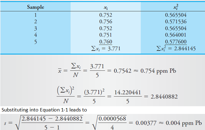 If we had rounded these numbers before subtracting them, a serious error would have appeared in the calculated value of s. To avoid this source of error, never round a standard deviation calculation until the very end. Furthermore, and for the same reason, never use Equation 1.2 to calculate the standard deviation of numbers containing five or more digits. Use Equation 1.1 instead. Many calculators and computers with a standard deviation function use a version of Equation 1.2 internally in the calculation. You should always be alert for roundoff errors when calculating the standard deviation of values that have five or more significant figures.