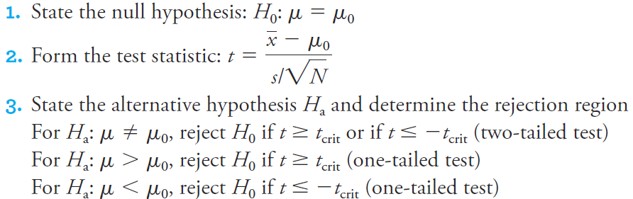 For a small number of results, we use a similar procedure to the z test except that the test statistic is the t statistic. Again we test the null hypothesis H0: m = m0, where m0 is a specific value of m such as an accepted value, a theoretical value, or a threshold value. The procedure is: