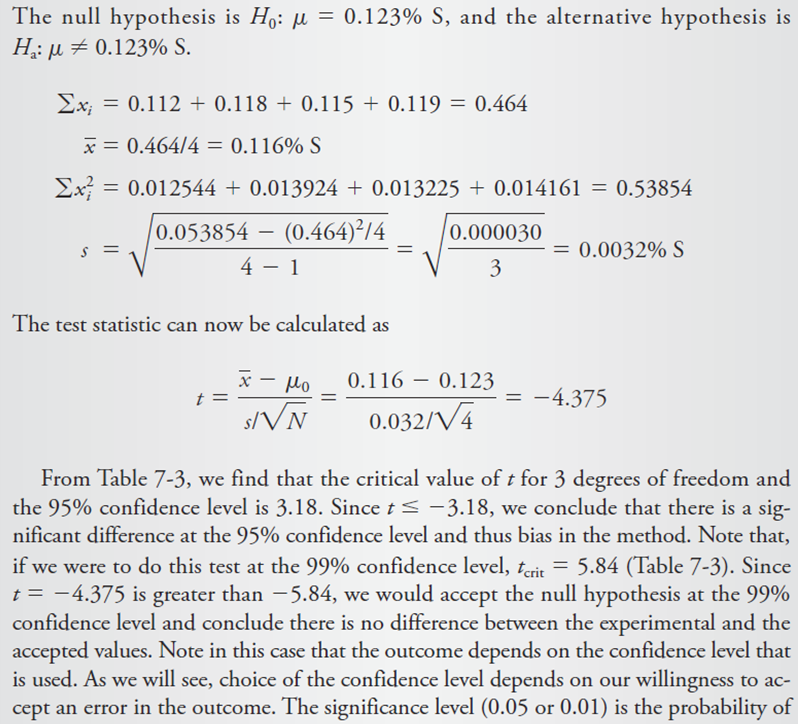 In testing for bias, we do not know initially whether the difference between the experimental mean and the accepted value is due to random error or to an actual systematic error. The t test is used to determine the significance of the difference. Example 7-5 illustrates the use of the t test to determine whether there is bias in a method.