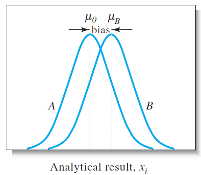 As an illustration, consider the testing for systematic error in an analytical method. In this case, a sample of accurately known composition, such as a standard reference material, is analyzed. Determination of the analyte in the material gives an experimental mean that is an estimate of the population mean. If the analytical method had no systematic error, or bias, random errors would give the frequency distribution shown by curve A in Figure 1.1. Method B has some systematic error so that x̅B, which estimates mB, differs from the accepted value m0. The bias is given by