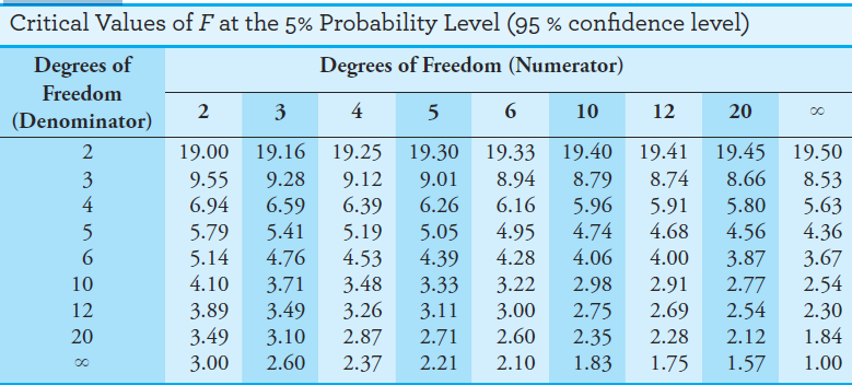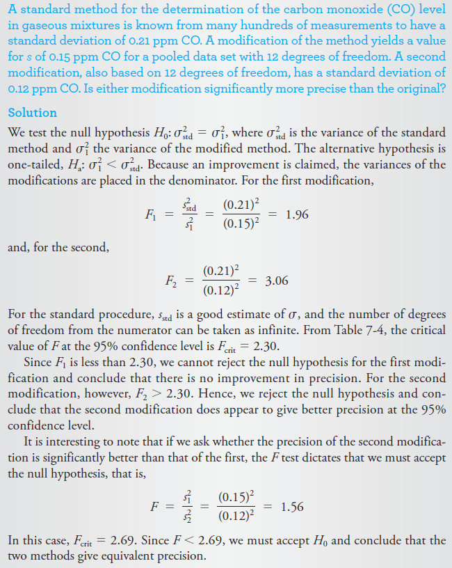 At times, there is a need to compare the variances (or standard deviations) of two data sets. For example, the normal t test requires that the standard deviations of the data sets being compared are equal. A simple statistical test, called the F test, can be used to test this assumption under the provision that the populations follow the normal (Gaussian) distribution. The F test is also used in comparing more than two means and in linear regression analysis. The F test is based on the null hypothesis that the two population variances under consideration are equal, H0: σ21 = σ22. The test statistic F, which is defined as the ratio of the two sample variances (F = s21/s22), is calculated and compared with the critical value of F at the desired significance level. The null hypothesis is rejected if the test statistic differs too much from unity. Critical values of F at the 0.05 significance level are shown in Table 1.1. Note that two degrees of freedom are given, one associated with the numerator and the other with the denominator. Most mathematical handbooks give more extensive tables of F values at various significance levels. The F test can be used in either a one-tailed mode or in a two-tailed mode. For a onetailed test we test the alternative hypothesis that one variance is greater than the other. Hence, the variance of the supposedly more precise procedure is placed in the denominator and that of the less precise procedure is placed in the numerator. The alternative hypothesis is Ha: σ21 > σ22 .