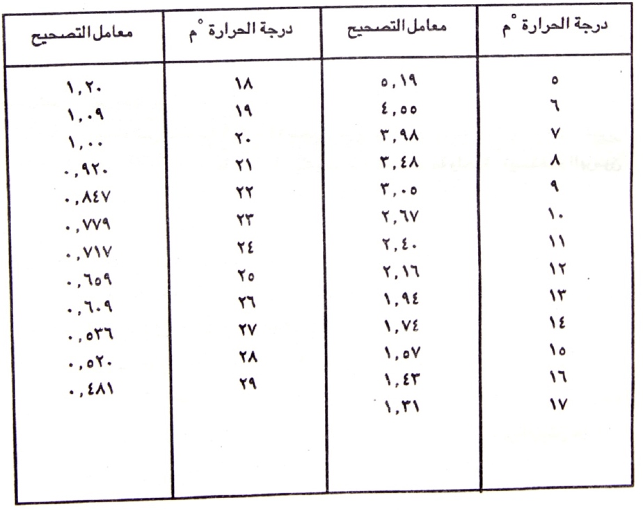 جدول بقيم عامل التصحيح (q) لضبط قيم الميتابوليزم على ٢٠ م طبقا للمنحنى الطبيعيKrogh 1914) &(Ege .
