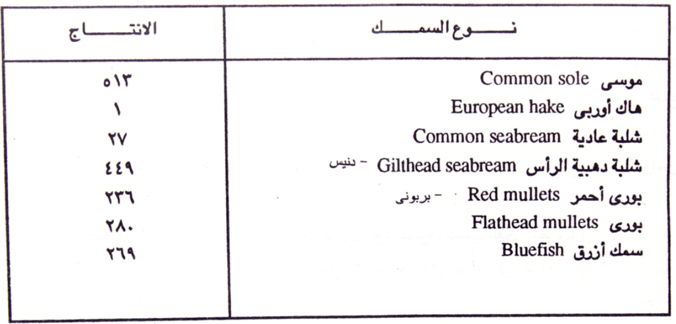 ويبلغ انتاج مصر من بعض الاسماك ( احصاء ۱۹۸۳ عن FAO ۱۹۸۷) الهامة بالطن: