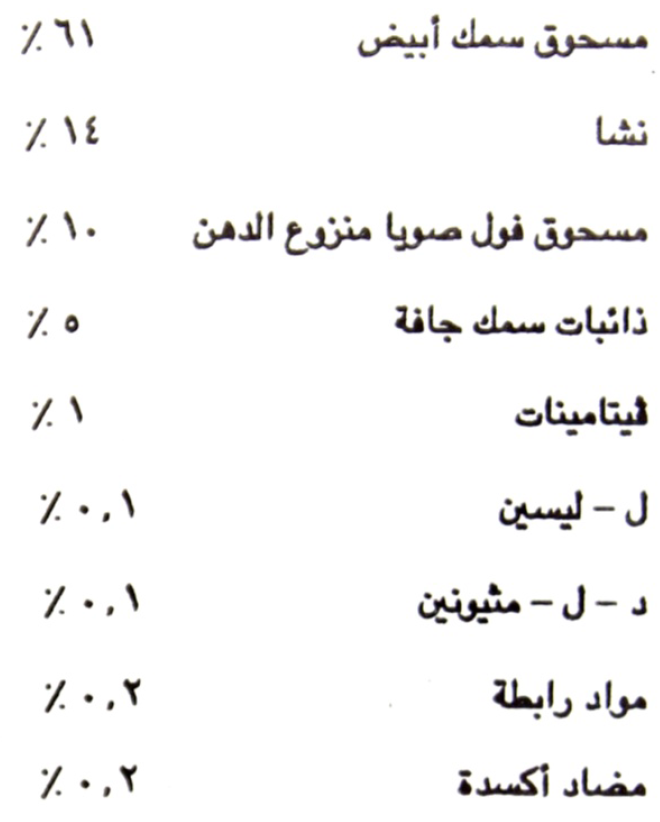 وتركيبة 40 ٪ بروتين ، 15 ٪ رماد ، ٢١ ٪ كربوهيدرات ، 3٪ ألياف ، ٩٪ رطوبة. وتعطى هذه العليقة معدل تحويل 2.45 مقارنة بالتغذية على فضلات السمك التي تعطى معدل تحويل 13.5 لمدة 90 يوما بداية من وزن 45 جم علي درجة حرارة 9.6-18.6 م.