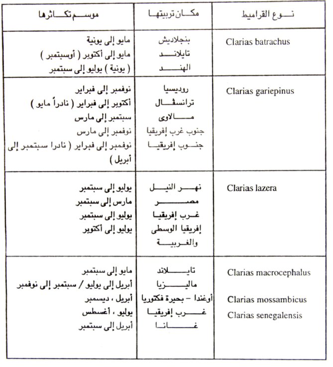 تبني الكلارياس عشوشا او ثقوبا بقطر حوالي 2۰–50 سم أسفل في الماء لوضع البيض وتجمع الزريعة بحصاد العشوش والتي يحتوى كل منها حوالى 5-2 آلاف قطعة من الزريعة، إلا أن هذا الإنتاج الطبيعي غير كاف لامتداد زراعة هذه الأنواع. لذا دخلت في منتصف الخمسينات عملية التكاثر بالمعالجة الهرمونية وحازت بعض النجاح، وتغذى الزريعة في أول 3-2 أسابيع على البلانكتون الحيواني ثم أخيرا على السمك المطبوخ، ويتم استزراع القراميط وتكاثرها صناعيا بنسبة حيوية تصل إلى 80–90 ٪ في اليوم الأربعين من الفقس، ولهذا الغرض تجمع الأسماك البالغة Spawners وتخزن في أحواض (35– 350 م٢) أرضية طينية وجدرانها من الخرسانة أو الحجر وعمق المياه 1– 1.5 م مع تزويد الحوض بكهوف على الجوانب أو أنابيب من الإسمنت أو البلاستك على القاع مع تغطية نصف مسطح الماء بنباتات مائية طافية (كورد النيل) لتوفير الظل والإحساس بالأمان للسمك. فتوضع الأسماك عمر 1.5 سنة أو ما تزيد عن 150 جم وزن (كل جنس منفصل عن الأخر) في أحواض بمعدل 15-17 سمكة في التر المربع قبل التبويض بمدة 3-4 شهور. و تغذي علي فضلات السمك المفرومة والأحشاء الحيوانية المفرومة ورجيع الأرز أو ردة القمح وكسب الفول الصويا أو كسب الفول السوداني بمعدل 3-5 ٪ من وزن السمك، مع خفض كمية الغذاء في حالة تغير ظروف المياه أو انخفاض درجة حرارة المياه. ولو كانت الأسماك من قطيع طبيعي Wild Stock فيجب معاملتها هرمونيا مباشرة لتجنب أثار الجروح وامتصاص الأسبرمات والبيض خلال فترة حبسها.