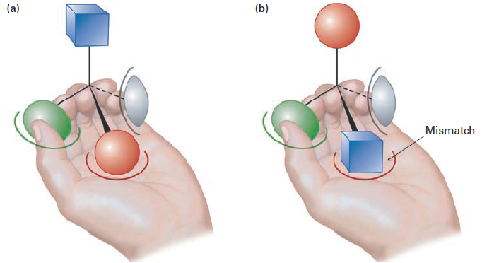Figure 1.1 Imagine that a left hand interacts with a chiral object, much as a biological receptor interacts with a chiral molecule. (a) One enantiomer fits into the hand perfectly: green thumb, red palm, and gray pinkie finger, with the blue substituent exposed. (b) The other enantiomer, however, can’t fit into the hand. When the green thumb and gray pinkie finger interact appropriately, the palm holds a blue substituent rather than a red one, with the red substituent exposed.