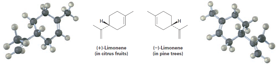 Although the different enantiomers of a chiral molecule have the same physical properties, they usually have different biological properties. For example, the (+) enantiomer of limonene has the odor of oranges and lemons, but the (-) enantiomer has the odor of pine trees.