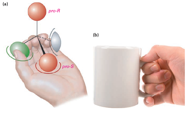 Figure 1.2 (a) When a prochiral molecule is held in a chiral environment, the two seemingly identical substituents are distinguishable. (b) Similarly, when an achiral coffee mug is held in the chiral environment of your hand, it’s much easier to drink from one side than the other because the two sides of the mug are now distinguishable.