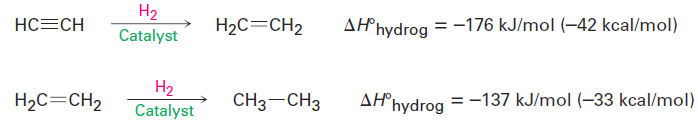 Alkynes are reduced to alkanes by addition of H2 over a metal catalyst. The reaction occurs in two steps through an alkene intermediate, and measurements show that the first step in the reaction is more exothermic than the second.