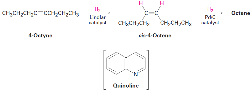 Complete reduction to the alkane occurs when palladium on carbon (Pd/C) is used as catalyst, but hydrogenation can be stopped at the alkene stage if the less active Lindlar catalyst is used. The Lindlar catalyst is a finely divided palladium metal that has been precipitated onto a calcium carbonate support and then deactivated by treatment with lead acetate and quinoline, an aromatic amine. The hydrogenation occurs with syn stereochemistry giving a cis alkene product.