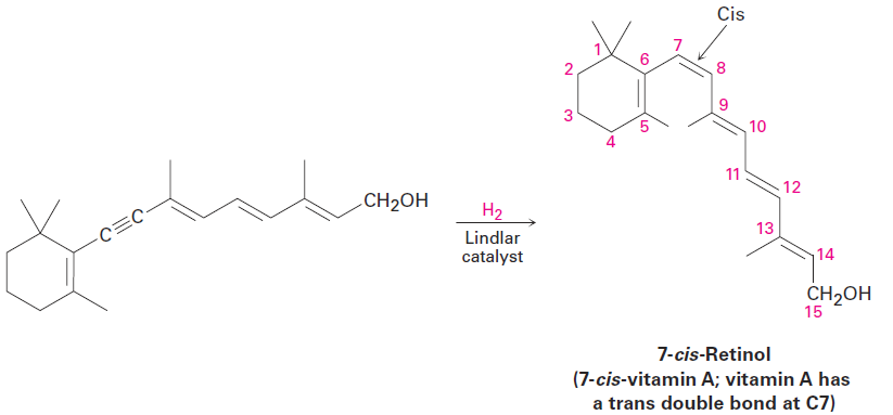 The alkyne hydrogenation reaction has been explored extensively by the Hoffmann–LaRoche pharmaceutical company, where it is used in the commercial synthesis of vitamin A. The cis isomer of vitamin A produced initially on hydrogenation is converted to the trans isomer by heating.