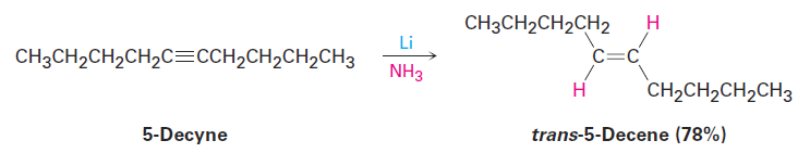 An alternative method for the conversion of an alkyne to an alkene uses sodium or lithium metal as the reducing agent in liquid ammonia as solvent. This method is complementary to the Lindlar reduction because it produces trans rather than cis alkenes. For example, 5-decyne gives trans-5-decene on treatment with lithium in liquid ammonia.