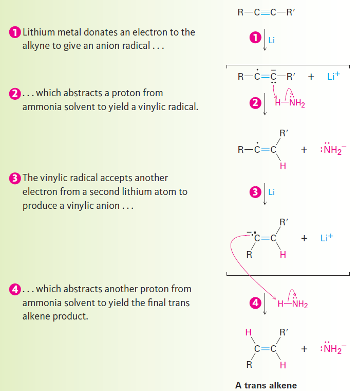 Alkali metals dissolve in liquid ammonia at 233 °C to produce a deep blue solution containing the metal cation and ammonia-solvated electrons. When an alkyne is then added to the solution, reduction occurs by the mechanism shown in Figure 1.1. An electron first adds to the triple bond to yield an intermediate anion radical—a species that is both an anion (has a negative charge) and a radical (has an odd number of electrons). This anion radical is a strong base, able to remove H+ from ammonia to give a vinylic radical. Addition of a second electron to the vinylic radical gives a vinylic anion, which abstracts a second H+ from ammonia to give trans alkene product.