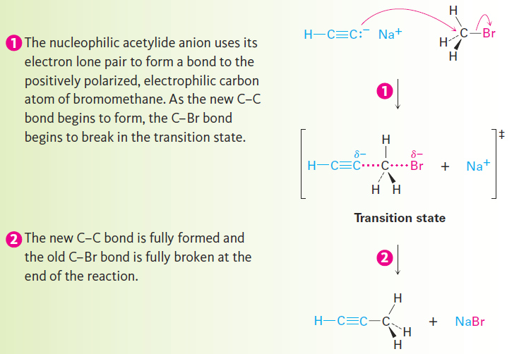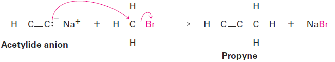 We won’t study the details of this substitution reaction but for now you can picture it as happening by the pathway shown in Figure 1.1. The nucleophilic acetylide ion uses an electron pair to form a bond to the positively polarized, electrophilic carbon atom of bromomethane. As the new C - C bond forms, Br- departs, taking with it the electron pair from the former C - Br bond and yielding propyne as product. We call such a reaction an alkylation because a new alkyl group has become attached to the starting alkyne.