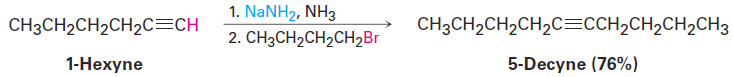 Alkyne alkylation is not limited to acetylene itself. Any terminal alkyne can be converted into its corresponding anion and then allowed to react with an alkyl halide to give an internal alkyne product. Hex-1-yne, for instance, gives dec-5-yne when treated first with NaNH2 and then with 1-bromobutane.
