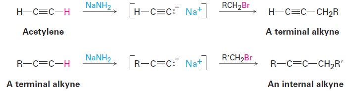 Because of its generality, acetylide alkylation is a good method for preparing substituted alkynes from simpler precursors. A terminal alkyne can be prepared by alkylation of acetylene itself, and an internal alkyne can be prepared by further alkylation of a terminal alkyne.