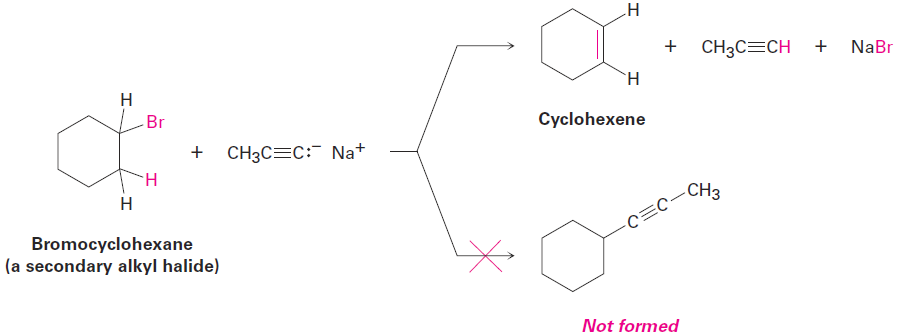 The alkylation reaction can only use primary alkyl bromides and alkyl iodides because acetylide ions are sufficiently strong bases to cause elimination instead of substitution when they react with secondary and tertiary alkyl halides. For example, reaction of bromocyclohexane with propyne anion yields the elimination product cyclohexene rather than the substitution product 1-propynylcyclohexane.
