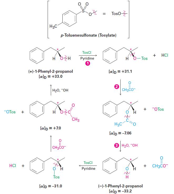 Following the work of Walden, further investigations were undertaken during the 1920s and 1930s to clarify the mechanism of nucleophilic substitution reactions and to find out how inversions of configuration occur. Among the first series studied was one that interconverted the two enantiomers of 1-phenyl-2-propanol (Figure 1-2). Although this particular series of reactions involves nucleophilic substitution of an alkyl p-toluenesulfonate (called a tosylate) rather than an alkyl halide, exactly the same type of reaction is involved as that studied by Walden. For all practical purposes, the entire tosylate group acts as if it were simply a halogen substituent. (In fact, when you see a tosylate substituent in a molecule, do a mental substitution and tell yourself that you’re dealing with an alkyl halide.)