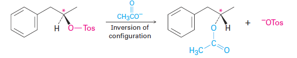 From this and nearly a dozen other series of similar reactions, researchers concluded that the nucleophilic substitution reaction of a primary or secondary alkyl halide or tosylate always proceeds with inversion of configuration. (Tertiary alkyl halides and tosylates, as we’ll see shortly, give different stereochemical results and react by a different mechanism.)