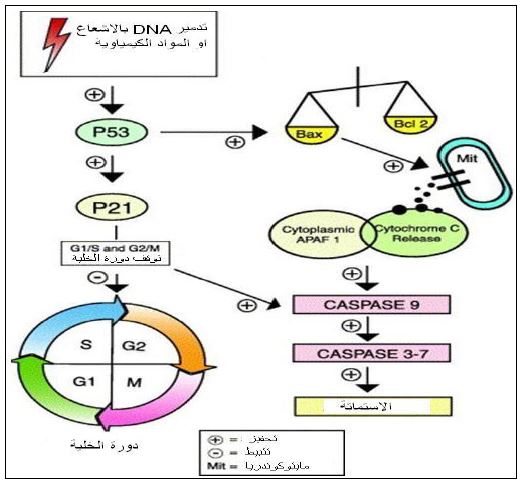 ومما يجدر ذكره دور البروتين P 53 في عملية الاستماتة ، فالبروتين من المكونات الخلوية المثبطة للأورام ، ويزداد تركيزه عندما يتضررDNA وزيادته تكون بعدة آليات منها وجود الانترفيرون-الفا والانترفيرون-بتا التي تحفز انتساخ الجين P 53 وبالتالي زيادة البروتين مؤدياً الى استماتة الخلايا السرطانية ، والبروتين P53 يوقف دورة الخلية عند المرحلة G 1 (من الطور البيني) لإعطاء الوقت الكافي لإصلاح DNA المتضرر ولكنه يحث الاستماتة اذا كانت عمليات الإصلاح اكبر من قابلية الخلايا ، ولذلك فان اي خلل في تنظيم جينP 53 والانترفيرونات يؤدي الى اضطراب الاستماتة وبالتالي تكوين الأورام .