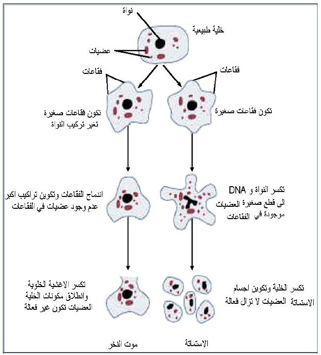 - يعاني الكروماتين من التكثيف ويظهر على شكل جيوب قرب الغشاء النووي ضمن ظاهرة Pyknosis والتي تعد من العلامات الفارقة للخلايا التي تعاني الاستماتة .