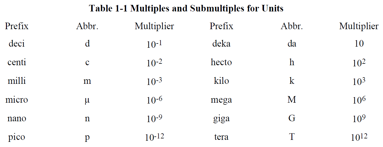 To express quantities much larger or smaller than the standard units, multiples or submultiples of these units are used, as shown in the Table 1-1. Thus, 10-12 s is a picosecond (ps), and 103 m is a kilometer (km). Since for historical reasons the SI reference unit for mass, the kilogram, already has a prefix, multiples for mass should be derived by applying the multiplier to the unit gram rather than to the kilogram. Thus 10-9 kg is a microgram (10-6 g), abbreviated μg.