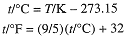 On the Celsius (or centigrade) scale, a temperature difference of 1°C is 1 K (exactly). The normal boiling point of water is 100°C, the normal freezing point 0°C, and absolute zero -273.15°C. On the Fahrenheit scale, a temperature difference of 1°F is 5/9 K (exactly). The boiling point and freezing point of water, and absolute zero are 212°F, 32°F and -459.67°F, respectively. Conversions from one temperature scale to another make use of the following equations: