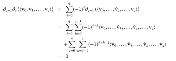 (since each term in this summation over j and k cancels with the corresponding term with j and k interchanged). The result now follows from the fact that the homomorphism ∂q−1 ◦ ∂q is determined by its values on all oriented q-simplices of K.