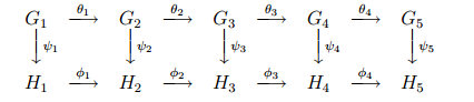 Lemma 1.3 (Five-Lemma) Suppose that the rows of the commutative diagram of Proposition 1.2 are exact sequences and that ψ1, ψ2, ψ4 and ψ5 are isomorphisms. Then ψ3 is also an isomorphism.