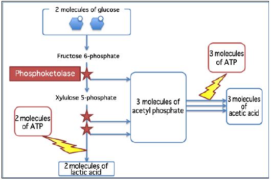 مسار لتمثيل السكريات السداسية عن طريق Phosphoketolase Pathway الخاص بالبكتريا المنشطرة Bifidobacteria كما في الشكل الاتي :