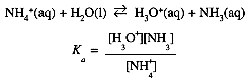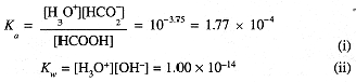 Solving the quadratic equation gives x = 4.12 × 10-3 or -4.30 × 10-3. The negative root makes no sense and we conclude that [H3O+] = [HCO2-] = 4.12 × 10-3 M, [HCOOH] = 0.096 M, pH = 2.38. Equation (ii) then gives [OH-] = 2.43 × 10-12 M. Here x is not quite small enough to ignore compared with 0.10, but in other problems where Ka is smaller, it may be a reasonable approximation.