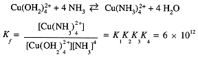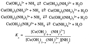K1 = 1.6 × 104, K2 = 3.2 × 103, K2 = 9.5 × 102, K4 = 1.3 × 102. Since ΔH° is nearly the same for each step, -23 kJ/mol, the decrease of Kn with increasing NH3 substitution is an entropy effect which can be partly explained by statistics. In the first step, any one of four H2O ligands can be replaced in the forward reaction but only one NH3 can be replaced in the reverse reaction, contributing a factor of 4 to K1. In the fourth step, the statistics are reversed, one H2O can be replaced in the forward reaction but any of four NH3 ligands can be replaced in the reverse step, contributing a factor of 1/4 to K4. We sometimes can use the overall formation constant corresponding to the sum of the four steps,