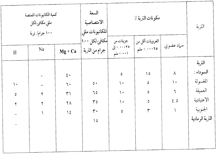 (أ) التربة السوداء الغنية بالمواد العضوية: تمتاز بسعة امتصاصية أعلى من جميع التراب وتزيد سعتها الامتصاصية عن 40 - 60 ملل مكافئ لكل ۱۰۰ جرام من التربة.