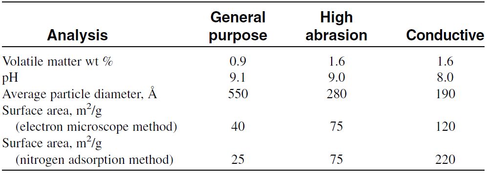 The important properties of carbon black are particle size, surface area, and pH. These properties are functions of the production process and the feed properties. Channel blacks are generally acidic, while those produced by the Furnace and Thermal processes are slightly alkaline.