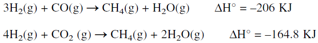 Catalytic methanation is the reverse of the steam reforming reaction. Hydrogen reacts with carbon monoxide and carbon dioxide, converting them to methane. Methanation reactions are exothermic, and methane yield is favored at lower temperatures: