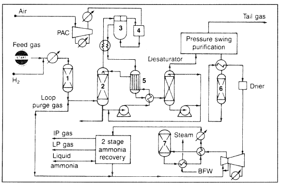 Figure 1.1. The ICI process for producing synthesis gas and ammonia:6 (1) desulfurization, (2) feed gas saturator, (3) primary reformer, (4) secondary reformer, (5) shift converter, (6) methanator, (7) ammonia reactor.