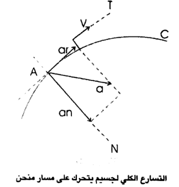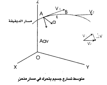 يبن الشكل (1) دقيقة مادية تتحرك على مسار منحن سرعتها عند A هي V1 وسرعتها عند النقطة B هي V2 . وعند إيجاد (V) ، فإننا نزيح المتجه V2 موازيا لنفسه بحيث تنطبق نقطة بدايته V1 على نقطة بداية (V) ، ثم نكمل المثلث لإيجاد (V) . وحيث ان الزمن الذي احتاجته الدقيقة في الحركة من (A) إلى (B) هو (t)، فإن متوسط تسارع الدقيقة في المسار المنحني هو ((aav حيث :
