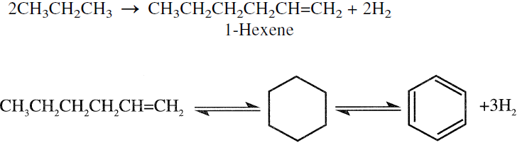 Liquefied petroleum gas (LPG), a mixture of propane and butanes, is catalytically reacted to produce an aromatic-rich product. The first step is assumed to be the dehydrogenation of propane and butane to the corresponding olefins followed by oligomerization to C6, C7, and C8 olefins. These compounds then dehydrocyclize to BTX aromatics. The following reaction sequence illustrates the formation of benzene from 2 propane molecules:
