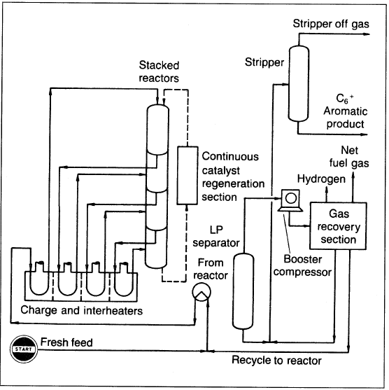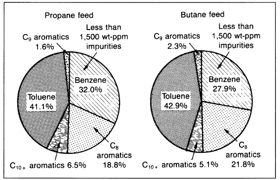 The process consists of a reactor section, continuous catalyst regeneration unit (CCR), and product recovery section. Stacked radial-flow reactors are used to minimize pressure drop and to facilitate catalyst recirculation to and from the CCR. The reactor feed consists solely of LPG plus the recycle of unconverted feed components; no hydrogen is recycled. The liquid product contains about 92 wt% benzene, toluene, and xylenes (BTX) (Figure 1.2), with a balance of C9+ aromatics and a low nonaromatic content. Therefore, the product could be used directly for the recovery of benzene by fractional distillation (without the extraction step needed in catalytic reforming).