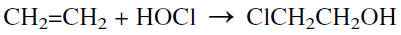 The reaction of ethylene with hydrogen chloride, on the other hand, produces ethyl chloride. This compound is a small-volume chemical with diversified uses (alkylating agent, refrigerant, solvent). Ethylene reactsalso with hypochlorous acid, yielding ethylene chlorohydrin: