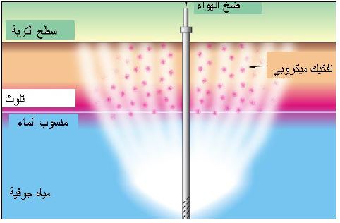 ضخ الهواء خلال الترب المراد معالجتها حيوياً للتخلص من التلوث ويتم ضخ الهواء / الأوكسجين من أسفل المواد لتساعد الأحياء الهوائية على تفكيك المواد الملوثة.