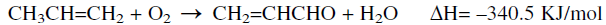 Transition metal oxides or their combinations with metal oxides from the lower row 5a elements were found to be effective catalysts for the oxidation of propene to acrolein. Examples of commercially used catalysts are supported CuO (used in the Shell process) and Bi2O3/MoO3 (used in the Sohio process). In both processes, the reaction is carried out at temperature and pressure ranges of 300–360°C and 1–2 atmospheres.
