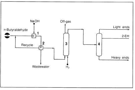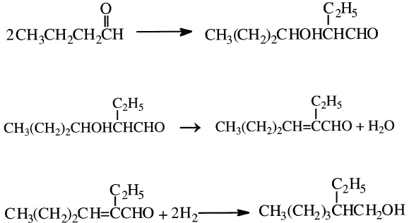 The reaction occurs in presence of aqueous caustic soda and produces 2-ethyl-3-hydroxyhexanal. The aldehyde is then dehydrated and hydrogenated to 2-ethylhexanol: