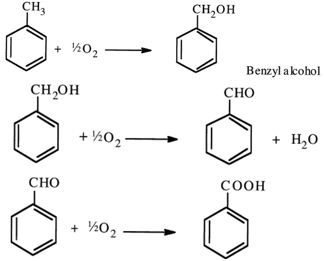 Oxidizing toluene to benzaldehyde is a catalyzed reaction in which a selective catalyst limits further oxidation to benzoic acid. In the first step, benzyl alcohol is formed and then oxidized to benzaldehyde. Further oxidation produces benzoic acid: