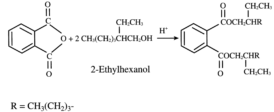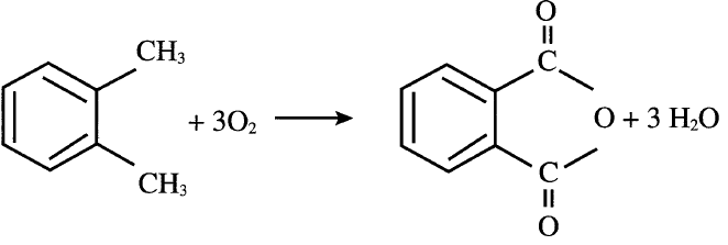 Liquid-phase oxidation of o-xylene also works at approximately 150°C. Cobalt or manganese acetate in acetic acid medium serves as a catalyst.The major by-products of this process are maleic anhydride, benzoic acid, and citraconic anhydride (methylmaleic anhydride). Maleic anhydride could be recovered economically. Phthalic anhydride’s main use is for producing plasticizers by reactions with C4–C10 alcohols. The most important polyvinyl chloride plasticizer is formed by the reaction of 2-ethylhexanol and phthalic anhydride: