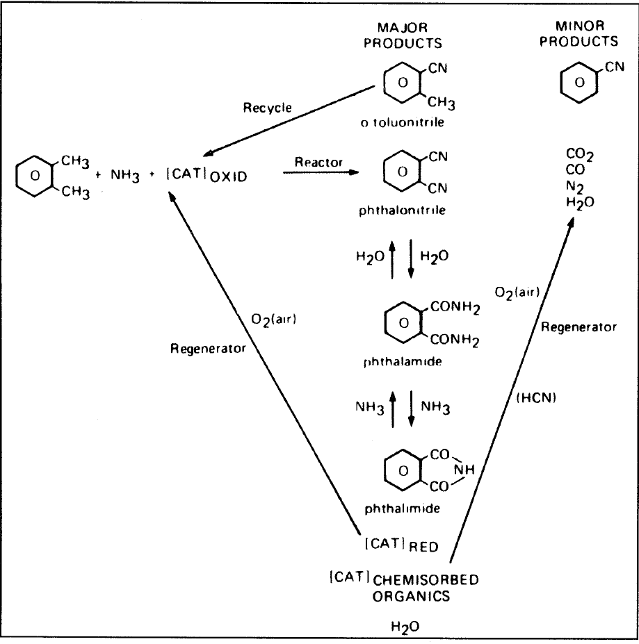 Phthalic anhydride is also used to make polyester and alkyd resins. It is a precursor for phthalonitrile by an ammoxidation route used to produce phthalamide and phathilimide. The reaction scheme for producing phthalonitrile, phthalamide, and phathilimide is shown in Figure 1.1.