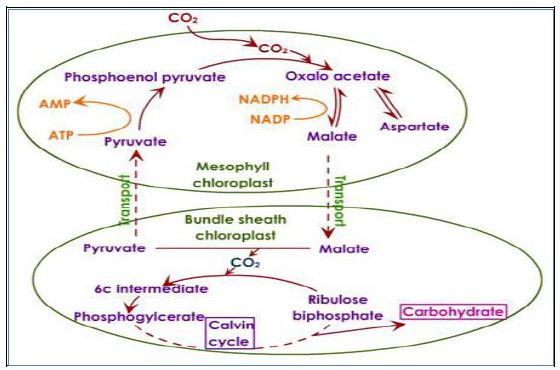 المسار الذي يتم في الظلام اثناء عمليات التخليق الضوئي التي تتم في النباتات الاستوائية مثل قصب السكر والذرة ونباتات المناطق الجافة وتعرف هذه النباتات ب C4 – Plants والمسار موضح في الشكل الآتي :